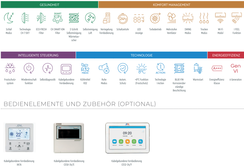 - Fortschrittliche Software zur Optimierung des Betriebs der Klimaanlage durch einen weiten Bereich der Rotationsfrequenz des Kompressors