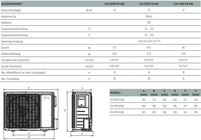 Außentemperaturbereich -15°C bis +24°C zum Heizen, -15°C bis +48°C zum Kühlen